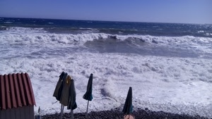 Mareggiata e ombrelloni bianchi