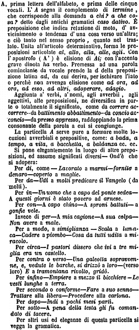 | A - prima lettera dell'alfabeto, e prima delle cinque vocali. L'A segna il complemento di termine, che corrisponde alla domanda a chi? a che cosa? detto dagli antichi gramatici caso dativo. È preposizione che indica relazione di moto, d'avvicinamento o tendenza d'una cosa verso un'altra; e ciò tanto nel senso proprio, quanto nel traslato. Unita all'articolo determinativo, forma le preposizioni articolate al, allo, alla, alle, agli. Con l'apostrofo (A') è elisione di Ai; con l'accento grave dinota ha verbo. Premessa ad una parola cominciante da vocale prende la d della preposizione latina ad, da cui deriva, per ischivare l'iato o perchè non avvenga elisione come ad ora, ad ora, ad esso, ad altri, adoperare, adagio.