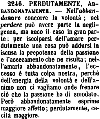 | Perdutamente, Abbandonatamente - Nell'abbandonare concorre la volontà; nel perdere può avere parte la negligenza, ma anco il caso in gran parte: per iscolparsi dell'amare perdutamente una cosa può addursi in iscusa la prepotenza della passione e l'accecamento che ne risulta; nell'amarla abbandonatamente, l'eccesso è tutta colpa nostra, perchè dell'energia della volontà e dell'animo non ci vagliamo onde frenare ciò che la passione ha di smodato. Però abbandonatamente esprime maggiore affetto; perdutamente, cecità maggiore. [immagine] |