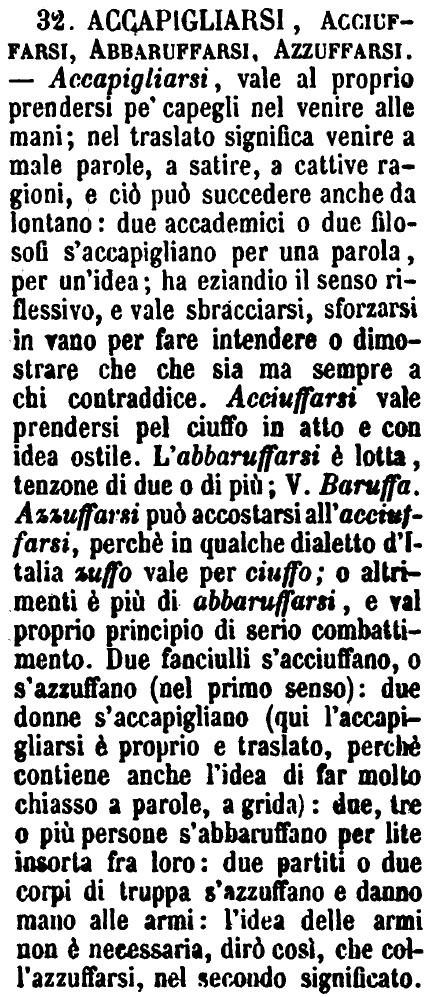 | Accapigliarsi, Acciuffarsi, Abbaruffarsi, Azzuffarsi - Accapigliarsi, vale al proprio prendersi pe' capegli nel venire alle mani; nel traslato significa venire a male parole, a satire, a cattive ragioni, e ciò può succedere anche da lontano: due accademici o due filosofi s'accapigliano per una parola, per un'idea; ha eziandio il senso riflessivo, e vale sbracciarsi, sforzarsi in vano per fare intendere o dimostrare che che sia ma sempre a chi contraddice. Acciuffarsi vale prendersi pel ciuffo in atto e con idea ostile. L'abbaruffarsi è lotta, tenzone di due o di più; V. Baruffa. Azzuffarsi può accostarsi all'acciuffarsi, perché in qualche dialetto d'Italia zuffo vale per ciuffo; o altrimenti è più di abbaruffarsi, e val proprio principio di serio combattimento. Due fanciulli s'acciuffano, o s'azzuffano (nel primo senso): due donne s'accapigliano (qui l'accapigliarsi è proprio e traslato, perché contiene anche l'idea di far molto chiasso a parole, a grida): due, tre o più persone s'abbaruffano per lite insorta fra loro: due partiti o due corpi di truppa s'azzuffano e danno mano alle armi: l'idea delle armi non è necessaria, dirò così, che coll'azzuffarsi, nel secondo significato. [immagine] |