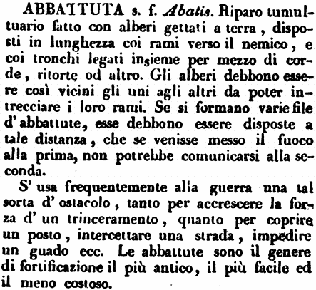 | Abbattuta - s. f. Abatis. Riparo tumultuario fatto con alberi gettati a terra, disposti in lunghezza coi rami verso il nemico, e coi tronchi legati insieme per mezzo di corde, ritorte od altro. Gli alberi debbono essere così vicini gli uni agli altri da poter intrecciare i loro rami. Se si formano varie file d'abbattute, esse debbono essere disposte a tale distanza, che se venisse messo il fuoco alla prima, non potrebbe comunicarsi alla seconda.