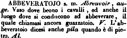 | Abbeveratojo - s. m. Abreuvoir, auge. Vaso dove beono i cavalli, ed anche il luogo dove si conducono ad abbeverare, il quale chiamasi ancora guazzatoio. V. L'abbeveratoio dicesi anche pila quando è di pietra. Al. [immagine] |