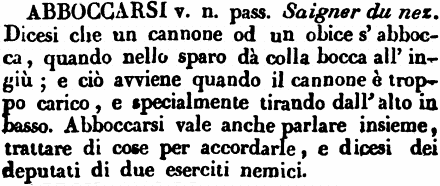 | Abboccarsi - v. n. pass. Saigner du nez. Dicesi che un cannone od un obice s'abbocca, quando nello sparo dà colla bocca all'ingiù; e ciò avviene quando il cannone è troppo carico, e specialmente tirando dall'alto in basso. Abboccarsi vale anche parlare insieme, trattare di cose per accordarle, e dicesi dei deputati di due eserciti nemici. [immagine] |