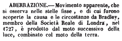 | Aberrazione - Movimento apparente, che si osserva nelle stelle fisse, e di cui furono scoperte la causa e le circostanze da Bradley, membro della Società Reale di Londra, nel 1727, è prodotto dal moto successivo della luce, combinato col moto della terra. [immagine] |