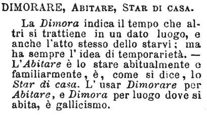 | Dimorare, Abitare, Star di casa - La Dimora indica il tempo che altri si trattiene in un dato luogo, e anche l'atto stesso dello starvi; ma ha sempre l'idea di temporarietà. - L'Abitare è lo stare abitualmente e familiarmente, è, come si dice, lo Star di casa. L'usar Dimorare per Abitare, e Dimora per luogo dove si abita, è gallicismo. [immagine] |
