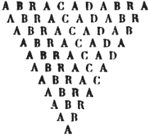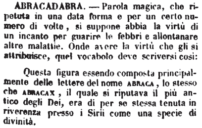 Abracadabra - Parola magica, che ripetuta in una data forma e per un certo numero di volte, si suppone abbia la virtù di un incanto per guarire le febbri e allontanare altre malattie. Onde avere la virtù che gli si attribuisce, quel vocabolo deve scriversi così: