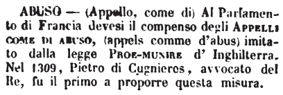 | Abuso - (Appello, come di) Al Parlamento di Francia devesi il compenso degli Appelli come di abuso, (appels comme d'abus) imitato dalla legge Proe-munire d'Inghilterra. Nel 1309, Pietro di Cugnieros, avvocato del Re, fu il primo a proporre questa misura. [immagine] |