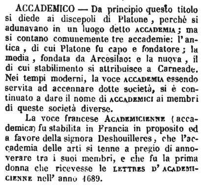La voce francese Academicienne (accademica) fu stabilita in Francia in proposito ed a favore della signora Deshouilleres, che l'accademia delle arti si tenne a pregio di annoverare tra i suoi membri, e che fu la prima donna che ricevesse le lettres d'academicienne nell'anno 1689. [immagine] |