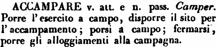 | Accampare - V. a. Da CAMPO. Raunare l'esercito a campo, Porlo a campo. Montecucc. Op. 1. 198. (C) Accampare l'esercito più vicino che si può, ma fuori del tiro del cannone.