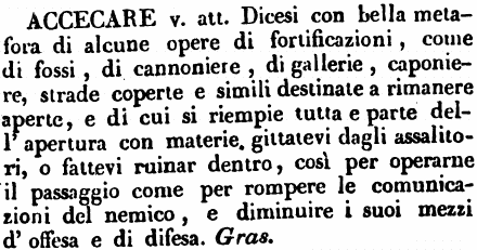 | Accecare - v. att. Dicesi con bella metafora di alcune opere di fortificazioni, come di fossi, di cannoniere, di gallerie, caponiere, strade coperte e simili destinate a rimanere aperte, e di cui si riempie tutta e parte dell'apertura con materie, gittatevi dagli assalitori, o fattevi ruinar dentro, così per operarne il passaggio come per rompere le comunicazioni del nemico, e diminuire i suoi mezzi d'offesa e di difesa. Gras. [immagine] |