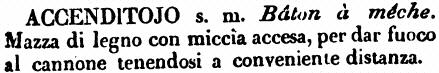 | Accenditojo - s. m. Báton à méche. Mazza di legno con miccia accesa, per dar fuoco al cannone tenendosi a conveniente distanza. [immagine] |