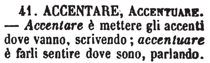 | Accentuare, Accentare - Pronunziando, secondo l'uso, piana, tronca o sdrucciola una parola e facendone sentire l'accento acuto o grave, si Accenta; pronunziando una o più parole spiccatamente e insistendo maggiormente colla voce sopra di esse cosicchè vengano a esser meglio notate da chi ascolta, si accentuano. L'Accentuare parlando equivale al sottolineare scrivendo. Chi scrive non può accentuare ma soltanto Accentare. Parlando, si può accentuar molto una parola e accentarla male, pronunziandola cioè con l'accento fuori del suo luogo naturale. - G. F.] [immagine] |