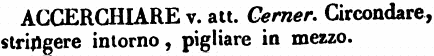 | Accerchiare - v. att. Cerner. Circondare, stringere intorno, pigliare in mezzo. [immagine] |