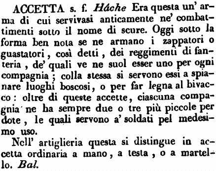 | Accetta - s. f. Háche Era questa un'arma di cui servivasi anticamente ne' combattimenti sotto il nome di scure. Oggi sotto la forma ben nota se ne armano i zappatori o guastatori, così detti, dei reggimenti di fanteria, de' quali ve ne suol esser uno per ogni compagnia; colla stessa si servono essi a spianare luoghi boscosi, o per far legna al bivacco: oltre di queste accette, ciascuna compagnia ne ha sempre due o tre più piccole per dote, le quali servono a' soldati pel medesimo uso.