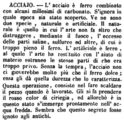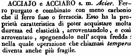 | Acciajo e Acciaro - s. m. Acier. Ferro purgato e combinato con meno carbonio che il ferro fuso o ferraccia. Esso ha la proprietà caratteristica di poter acquistare molta durezza ed elasticità, arroventandolo, e così arroventato, spegnendolo nell'acqua fredda: nella quale operazione che chiamasi tempera diventa anche più fragile. [immagine] |