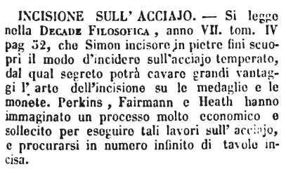 | Incisione sull’acciajo - Si legge nella Decade Filosofica, anno VII. tom. IV pag 52, che Simon incisore in pietre fini scuoprì il modo d'incidere sull'acciajo temperato, dal qual segreto potrà cavare grandi vantaggi l'arte dell'incisione su le medaglie e le monete. Perkins, Fairmann e Heath hanno immaginato un processo molto economico e sollecito per eseguire tali lavori sull'acciajo, e procurarsi in numero infinito di tavole incisa. [immagine] |