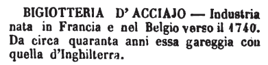 | Bigiotteria d’acciajo - Industria nata in Francia e nel Belgio verso il 1740. Da circa quaranta anni essa gareggia con quella d'Inghilterra. [immagine] |