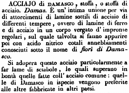 Acciajo di Damasco - stoffa, o stoffa di acciaio. Damas. È un'intima unione per via di attorcimenti di lamine sottili di acciaio di differenti tempere, ovvero di lamine di ferro e di acciaio in un corpo vergato d'impronte regolari, sul quale talvolta si fanno apparire poi con acido nitrico cotali annebbiamenti conosciuti sotto il nome di fiori di Damasco.