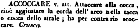 | Accoccare - v. att. Attaccare alla cocca, cioè aggiustare la corda dell'arco nella tacca o cocca dello strale; ha per contrario scoccare. Crusca. [immagine] |