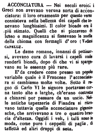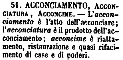| Acconciamento, Acconciatura, Acconcime - L'acconciamento è l'atto dell'acconciare; l'acconciatura è il prodotto dell'acconciamento; acconcime è riattamento, ristaurazione e quasi rifacimento di case e di poderi. [immagine] |