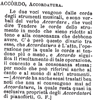 | Accordo, Accordatura - Le due voci vengono dalle corde degli strumenti musicali, e sono verbali del verbo Accordare, che vuol dire Tendere le corde dello strumento in modo che sieno ridotte al tono e alla consonanza che debbono avere. C'è però questo divario tra esse, che Accordatura è L'atto, l'operazione per la quale le corde si tendono più o meno, e Accordo significa Il risultamento di tale operazione, il concento e la consonanza stessa; per modo che può riferirsi anche al canto e al suono di altri strumenti. - [Accordo ha anche sensi traslati ben noti che non si convergono mai ad Accordatura, la quale resta quasi in esclusiva proprietà degli Accordatori di pianoforti, G. F.] [immagine] |