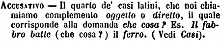 | Accusativo - Il quarto de' casi latini, che noi chiamiamo complemento oggetto o diretto, il quale corrisponde alla domanda che cosa? Es. Il fabbro batte (che cosa?) il ferro. (Vedi Casi). [immagine] |