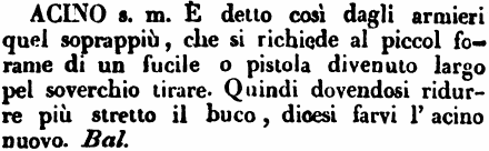 | Acino - s. m. È detto così dagli armieri quel soprappiù, che si richiede al piccol forame di un fucile o pistola divenuto largo pel soverchio tirare. Quindi dovendosi ridurre più stretto il buco, dicesi farvi l'acino nuovo. Bal. [immagine] |