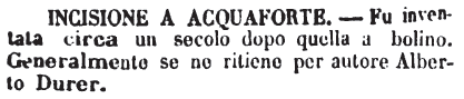 | Incisione a acquaforte a imitazione della pittura - Fu inventata circa un secolo dopo quella a bolino. Generalmente se ne ritiene per autore Alberto Durer. [immagine] |