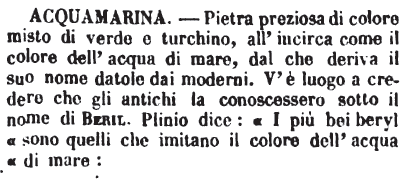 | Acquamarina - Pietra preziosa di colore misto di verde e turchino, all'incirca come il colore dell'acqua di mare, dal che deriva il suo nome datole dai moderni. V'è luogo a credere che gli antichi la conoscessero sotto il nome di Beril. Plinio dice: «I più bei beryl sono quelli che imitano il colore dell'acqua di mare» [immagine] |