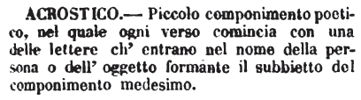 | Acrostico - Piccolo componimento poetico, nel quale ogni verso comincia con una delle lettere ch'entrano nel nome della persona o dell'oggetto formante il subbietto del componimento medesimo. [immagine] |