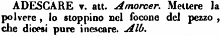 | Adescare - v. att. Amorcer. Mettere la polvere, lo stoppino nel focone del pezzo, che dicesi pure inescare. Alb. [immagine] |