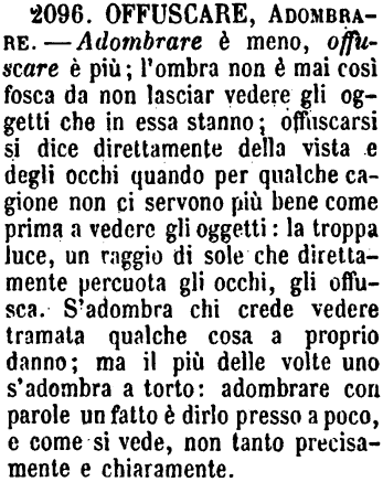 | Offuscare, Adombrare - Adombrare è meno, offuscare è più; l'ombra non è mai così fosca da non lasciar vedere gli oggetti che in essa stanno; offuscarsi si dice direttamente della vista e degli occhi quando per qualche cagione non ci servono più bene come prima a vedere gli oggetti: la troppa luce, un raggio di sole che direttamente percuota gli occhi, gli offusca. S'adombra chi crede vedere tramata qualche cosa a proprio danno; ma il più delle volte uno s'adombra a torto: adombrare con parole un fatto è dirlo presso a poco, e come si vede, non tanto precisamente e chiaramente. [immagine] |