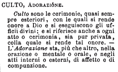 | Culto, Adorazione - Culto sono le cerimonie, quasi sempre esteriori, con le quali si rende onore a Dio e si eseguiscono gli ufficii divini; e si riferisce anche a ogni atto o cerimonia, sia pur privata, colla quale si rende tal onore. - L'Adorazione sta, più che altro, nella orazione o mentale o orale, e negli atti interni o esterni, di affetto e di compunzione. [immagine] |