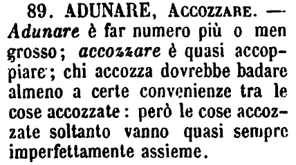| Adunare, Accozzare - Adunare è far numero più o men grosso; accozzare è quasi accoppiare; chi accozza dovrebbe badare almeno a certe convenienze tra le cose accozzate: però le cose accozzate soltanto vanno quasi sempre imperfettamente assieme. [immagine] |