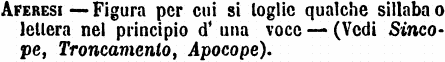 | Aferesi - Figura per cui si toglie qualche sillaba o lettera nel principio d'una voce - (Vedi Sincope, Troncamento, Apocope). [immagine] |