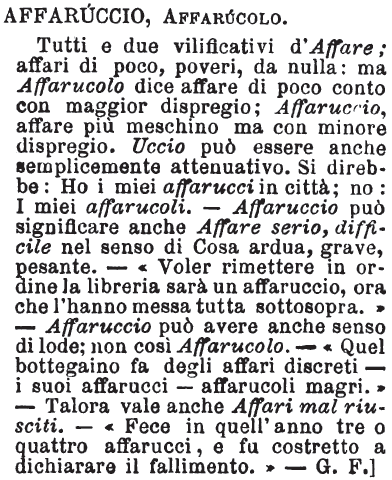 | Affaruccio, Affarucolo - Tutti e due vilificativi d'Affare; affari di poco, poveri, da nulla: ma Affarucolo dice affare di poco conto con maggior dispregio; Affaruccio, affare più meschino ma con minore dispregio. Uccio può essere anche semplicemente attenuativo. Si direbbe: Ho i miei affarucci in città; no: I miei affarucoli. - Affaruccio può significare anche Affare serio, difficile nel senso di Cosa ardua, grave, pesante. - «Voler rimettere in ordine la libreria sarà un affaruccio, ora che l'hanno messa tutta sottosopra.» - Affaruccio può avere anche senso di lode; non così Affarucolo. - «Quel bottegaino fa degli affari discreti - i suoi affarucci - affarucoli magri.» - Talora vale anche Affari mal riusciti. - «Fece in quell'anno tre o quattro affarucci, e fu costretto a dichiarare il fallimento.» - G.F.] [immagine] |