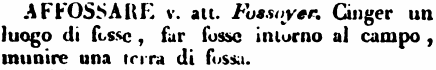 | Affossare - v. att. Fossoyer. Cinger un luogo di fosse, far fosse intorno al campo, munire una terra di fossa. [immagine] |