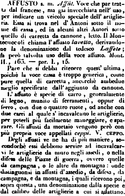 | Affusto - s. m. Affüt. Voce che par tratta dal francese, ma già invecchiata nell'uso, per indicare un veicolo speciale dell'artiglieria. Essa si trova nel d'Antoni sotto il nome di cassa, ed in alcuni altri Autori sotto quello di carretta da cannone, letto. Il Montecuccoli chiama l'affusto lavetta, derivandone la denominazione dal tedesco Laffete; fa però talvolta uso della voce affusto. Mont. II., 163. - par. I., 15.