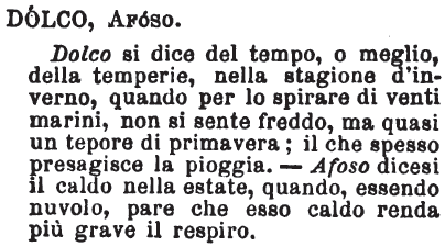 | Dolco, Afoso - Dolco si dice del tempo, o meglio, della temperie, nella stagione d'inverno, quando per lo spirare di venti marini, non si sente freddo, ma quasi un tepore di primavera; il che spesso presagisce la pioggia. - Afoso dicesi il caldo nella estate, quando, essendo nuvolo, pare che esso caldo renda più grave il respiro. [immagine] |