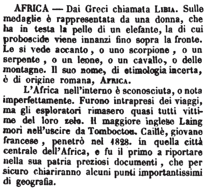 L'Africa nell'interno è sconosciuta, o nota imperfettamente. Furono intrapresi dei viaggi, ma gli esploratori rimasero quasi tutti vittime del loro zelo. Il maggiore inglese Laing morì nell'uscire da Tomboctou. Caillè, giovane francese, penetrò nel 1828. in quella città centrale dell'Africa, e fu il primo a riportare nella sua patria preziosi documenti, che per sicuro chiariranno alcuni punti importantissimi di geografia. [immagine] |