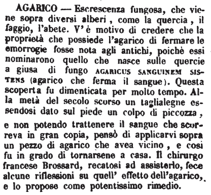 | Agarico - Escrescenza fungosa, che viene sopra diversi alberi, come la quercia, il faggio, l'abete. V'è motivo di credere che la proprietà che possiede l'agarico di fermare le emorrogie fosse nota agli antichi, poichè essi nominarono quello che nasce sulle quercie a giusa di fungo AGARICUS SANGUINEM SISTENS (agarico che ferma il sangue). Questa scoperta fu dimenticata per molto tempo. Alla metà del secolo scorso un taglialegne essendosi dato sul piede un colpo di piccozza, e non potendo trattenere il sangue che scorreva in gran copia, pensò di applicarvi sopra un pezzo di agarico che avea vicino, e così fu in grado di tornarsene a casa. Il chirurgo francese Brossard, recatosi ad assisterlo, fece alcune riflessioni su quell'effetto dell'agarico, e lo propose come potentissimo rimedio. [immagine] |