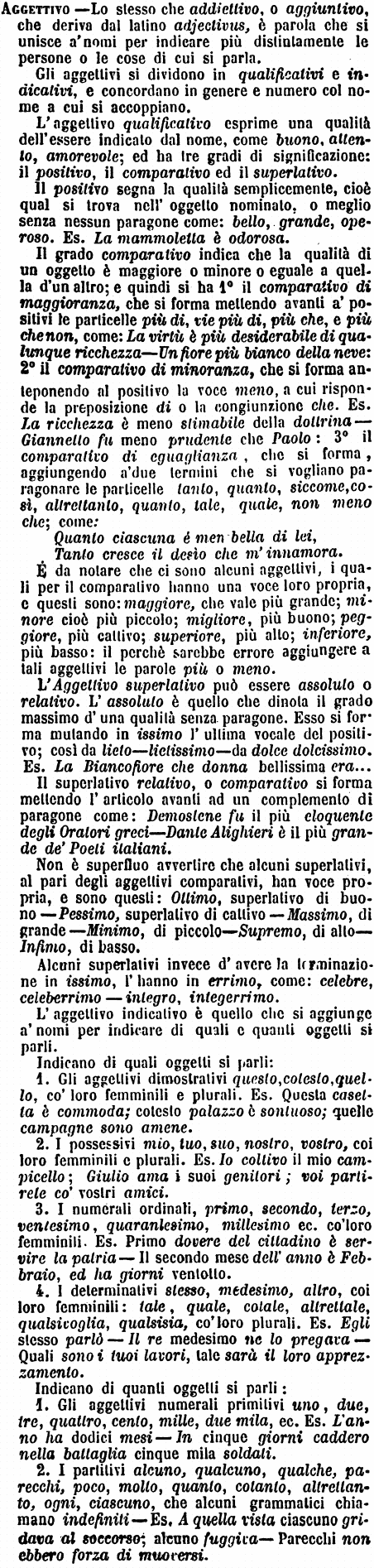 Gli aggettivi si dividono in qualificativi e indicativi, e concordano in genere e numero col nome a cui si accoppiano. L'aggettivo qualificativo esprime una qualità dell'essere indicato dal nome, come buono, attento, amorevole; ed ha tre gradi di significazione: il positivo, il comparativo ed il superlativo. Il positivo segna la qualità semplicemente, cioè qual si trova nell'oggetto nominato, o meglio senza nessun paragone come: bello, grande, operoso. Es. La mammoletta è odorosa. Il grado comparativo indica che la qualità di un oggetto è maggiore o minore o eguale a quella d'un altro; e quindi si ha 1° il comparativo di maggioranza, che si forma mettendo avanti a' positivi le particelle più di, vie più di, più che, e più che non, come: La virtù è più desiderabile di qualunque ricchezza - Un fiore più bianco della neve: 2° il comparativo di minoranza, che si forma anteponendo al positivo la voce meno, a cui risponde la preposizione di o la congiunzione che. Es. La ricchezza è meno stimabile della dottrina - Giannetto fu meno prudente che Paolo: 3° il comparativo di eguaglianza, che si forma, aggiungendo a' due termini che si vogliano paragonare le particelle tanto, quanto, siccome, così, altrettanto, quanto, tale, quale, non meno che; come: Quanto ciascuna è men bella di lei, Tanto cresce il desìo che m'innamora. É da notare che ci sono alcuni aggettivi, i quali per il comparativo hanno una voce loro propria, e questi sono: maggiore, che vale più grande; minore cioè più piccolo; migliore, più buono; peggiore, più cattivo; superiore, più alto; inferiore, più basso: il perchè sarebbe errore aggiungere a tali aggettivi le parole più o meno. L'Aggettivo superlativo può essere assoluto o relativo. L'assoluto è quello che dinota il grado massimo d'una qualità senza paragone. Esso si forma mutando in issimo l'ultima vocale del positivo; così da lieto - lietissimo - da dolce dolcisissimo. Es. La Biancofiore che donna bellissima era... Il superlativo relativo, o comparativo si forma mettendo l'articolo avanti ad un complemento di paragone come: Demostene fu il più eloquente degli Oratori greci - Dante Alighieri è il più grande de' Poeti italiani. Non è superfluo avvertire che alcuni superlativi, al pari degli aggettivi comparativi, han voce propria, e sono questi: Ottimo, superlativo di buono - Pessimo, superlativo di cattivo - Massimo, di grande - Minimo, di piccolo - Supremo, di alto - Infimo, di basso. Alcuni superlativi invece d'avere la terminazione in issimo, l'hanno in errimo, come: celebre, celeberrimo - integro, integerrimo. L'aggettivo indicativo è quello che si aggiunge a' nomi per indicare di quali e quanti oggetti si parli. Indicano di quali oggetti si parli: 1. Gli aggettivi dimostrativi questo, cotesto, quello, co' loro femminili e plurali. Es. Questa casetta è commoda; cotesto palazzo è sontuoso; quelle campagne sono amene. 2. I possessivi mio, tuo, suo, nostro, vostro, coi loro femminili e plurali. Es. Io coltivo il mio campicello; Giulio ama i suoi genitori; voi partirete co' vostri amici. 3. I numeri ordinari, primo, secondo, terzo, ventesimo, quarantesimo, millesimo ec. co' loro femminili. Es. Primo dovere del cittadino è servire la patria - Il secondo mese dell'anno è Febbraio, ed ha giorni ventotto. 4. I determinativi stesso, medesimo, altro, coi loro femminili: tale, quale, cotale, altrettale, qualsivoglia, qualsisia, co' loro plurali. Es. Egli stesso parlò - Il re medesimo ne lo pregava - Quali sono i tuoi lavori, tale sarà il loro apprezzamento. Indicano di quanti oggetti si parli: 1. Gli aggettivi numereali primitivi uno, due, tre, quattro, cento, mille, due mila, ec. Es. L'anno ha dodici mesi - In cinque giorni caddero nella battaglia cinque mila soldati. 2. I partitivi alcuno, qualcuno, qualche, parecchi, poco, molto, quanto, cotanto, altrettanto, ogni, ciascuno, che alcuni grammatici chiamano indefiniti - Es. A quella vista ciascuno gridava al soccorso; alcuno fuggiva - Parecchi non ebbero forza di muoversi. [immagine] |