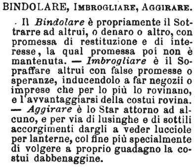 | Bindolare, Imbrogliare, Aggirare - Il Bindolare è propriamente il Sottrarre ad altrui, o denaro o altro, con promessa di restituzione e di interesse, la qual promessa poi non è mantenuta. - Imbrogliare è il Sopraffare altrui con false promesse o speranze, inducendolo a far negozii o imprese che per lo più lo rovinano, e l'avvantaggiarsi della costui rovina. - Aggirare è lo Star attorno ad alcuno, e per via di lusinghe e di sottili accorgimenti dargli a veder lucciole per lanterne, col fine più specialmente di volgere a proprio guadagno la costui dabbenaggine. [immagine] |