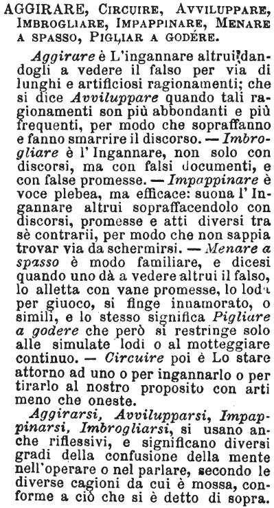 Aggirare, Circuire, Avviluppare, Imbrogliare, Impappinare, Menare a spasso, Pigliar a godere - Aggirare è L'ingannare altrui, dandogli a vedere il falso per via di lunghi e artificiosi ragionamenti; che si dice Avviluppare quando tali ragionamenti son più abbondanti e più frequenti, per modo che sopraffanno e fanno smarrire il discorso. - Imbrogliare è l'Ingannare, non solo con discorsi, ma con falsi documenti, e con false promesse. - Impappinare è voce plebea, ma efficace: suona l'Ingannare altrui sopraffacendolo con discorsi, promesse e atti diversi tra sè contrarii, per modo che non sappia trovar via da schermirsi. - Menare a spasso è modo familiare, e dicesi quando uno dà a vedere altrui il falso, lo alletta con vane promesse, lo loda per giuoco, si finge innamorato, o simili, e lo stesso significa Pigliare a godere che però si restringe solo alle simulate lodi o al motteggiare continuo. - Circuire poi è Lo stare attorno ad uno o per ingannarlo o per tirarlo al nostro proposito con arti meno che oneste.