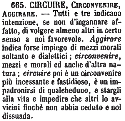 | Circuire, Circonvenire, Aggirare - Tutti e tre indicano intenzione, se non d'ingannare affatto, di volgere almeno altri in certo senso a noi favorevole. Aggirare indica forse impiego di mezzi morali soltanto e dialettici; circonvenire, mezzi e morali ed anche d'altra natura; circuire poi è un circonvenire più incessante e fastidioso, è un impadronirsi di qualcheduno, e stargli alla vita e impedire che altri lo avvicini finchè non abbia ceduto e nol dissuada. [immagine] |