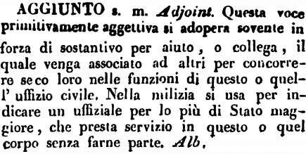 | Aggiunto - s. m. Adjoint. Questa voce primitivamente aggettiva si adopera sovente in forza di sostantivo per aiuto, o collega, il quale venga associato ad altri per concorrere seco loro nelle funzioni di questo o quell'uffizio civile. Nella milizia si usa per indicare un uffiziale per lo più di Stato maggiore, che presta servizio in questo o quel corpo senza farne parte. Alb. [immagine] |