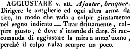 | Aggiustare - v. att. Ajuster, braquer. Dirigere le artiglierie ed ogni altra arma da tiro, in modo che vada a colpir giustamente nel segno indicato - Tirar drittamente, colpire giusto, è dove s'intende di dare. Si raccomanda di aggiustare la mira a mezz'uomo, perchè il colpo rialza sempre un poco. [immagine] |