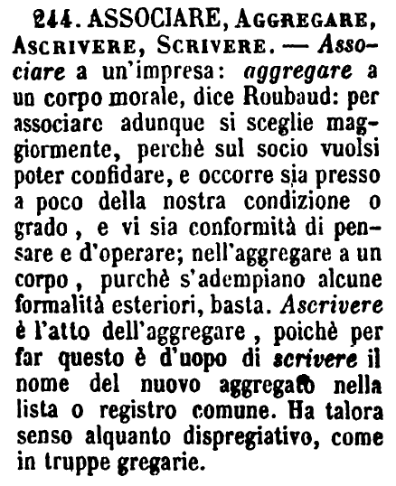 | Associare, Aggregare, Ascrivere, Scrivere - Associare a un'impresa: aggregare a un corpo morale, dice Roubaud: per associare adunque si sceglie maggiormente, perchè sul socio vuolsi poter confidare, e occorre sia presso a poco della nostra condizione o grado, e vi sia conformità di pensare e d'operare; nell'aggregare a un corpo, purchè s'adempiano alcune formalità esteriori, basta. Ascrivere è l'atto dell'aggregare, poichè per far questo è d'uopo di scrivere il nome del nuovo aggregato nella lista o registro comune. Ha talora senso alquanto dispregiativo, come in truppe gregarie. [immagine] |