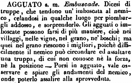 | Agguato - s. m. Embuscade. Dicesi di truppe, che tendono un'imboscata al nemico, celandosi in qualche luogo per piombargli addosso, e sorprenderlo. Gli agguati o imboscate possono farsi di più maniere, cioè nei villaggi, nelle vigne, nel grano, ne' boschi; ma quei nel grano riescono i migliori, poichè difficilmente il nemico può circondare ed assaltare una truppa, di cui non conosce nè la forza, nè la posizione - Porsi in agguato, vale osservare e spiare gli andamenti del nemico, onde poterlo assalire alla sprovveduta. [immagine] |