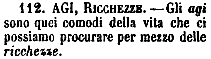 | Agi, Ricchezze - Gli agi sono quei comodi della vita che ci possiamo procurare per mezzo delle ricchezze. [immagine] |